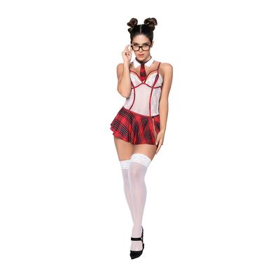 • Incluye: Body con abertura posterior, falda y collar con corbata. NO incluye medias.